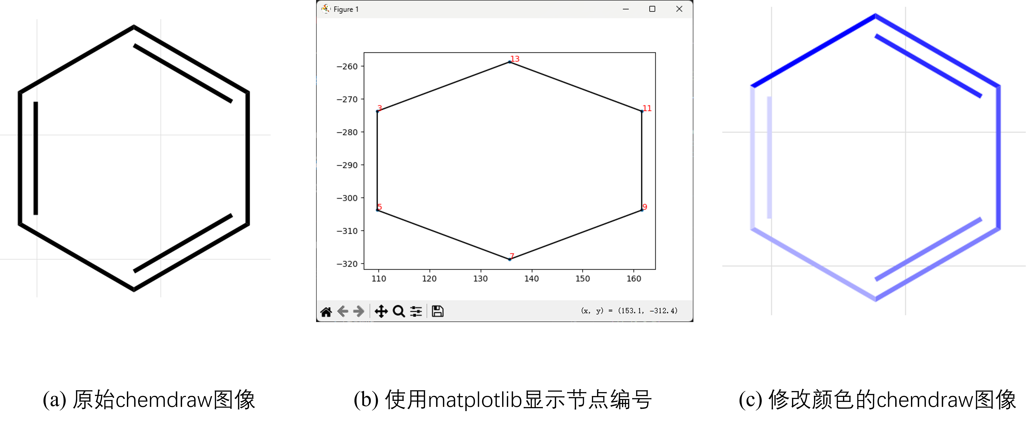 如图所示(a)是再chemdraw直接绘制的苯环,全是黑色的。(b)是使用matplotlib绘制的键的节点编号,在代码中可以通过指定键两侧的节点设置键的颜色。(c)是设置颜色之后的chemdraw图像